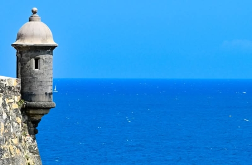 Wandering through the historic streets of El Viejo San Juan, I found a spot where I could climb up high and take in an incredible scene. The view stretched out before me, showing the horizon where the sky kisses the ocean. A tiny boat was floating…