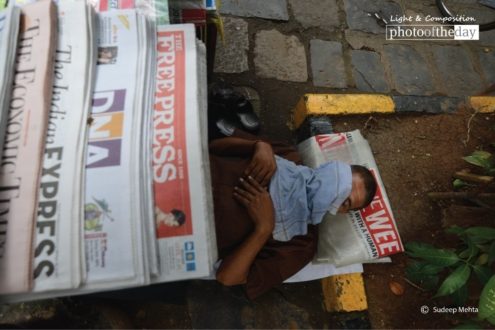 A newspaper vendor in Mumbai city takes a short nap on the public footpath under his market stall.