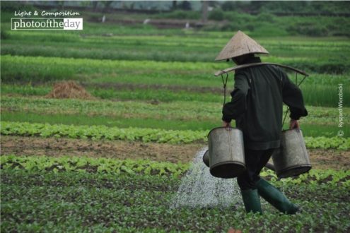 Watering fields is a part of daily activities of every farmer in Vietnam. Green fields look great from the road, but such outstanding landscapes need to be preserved by people, local villagers, and their hard work to grow them.