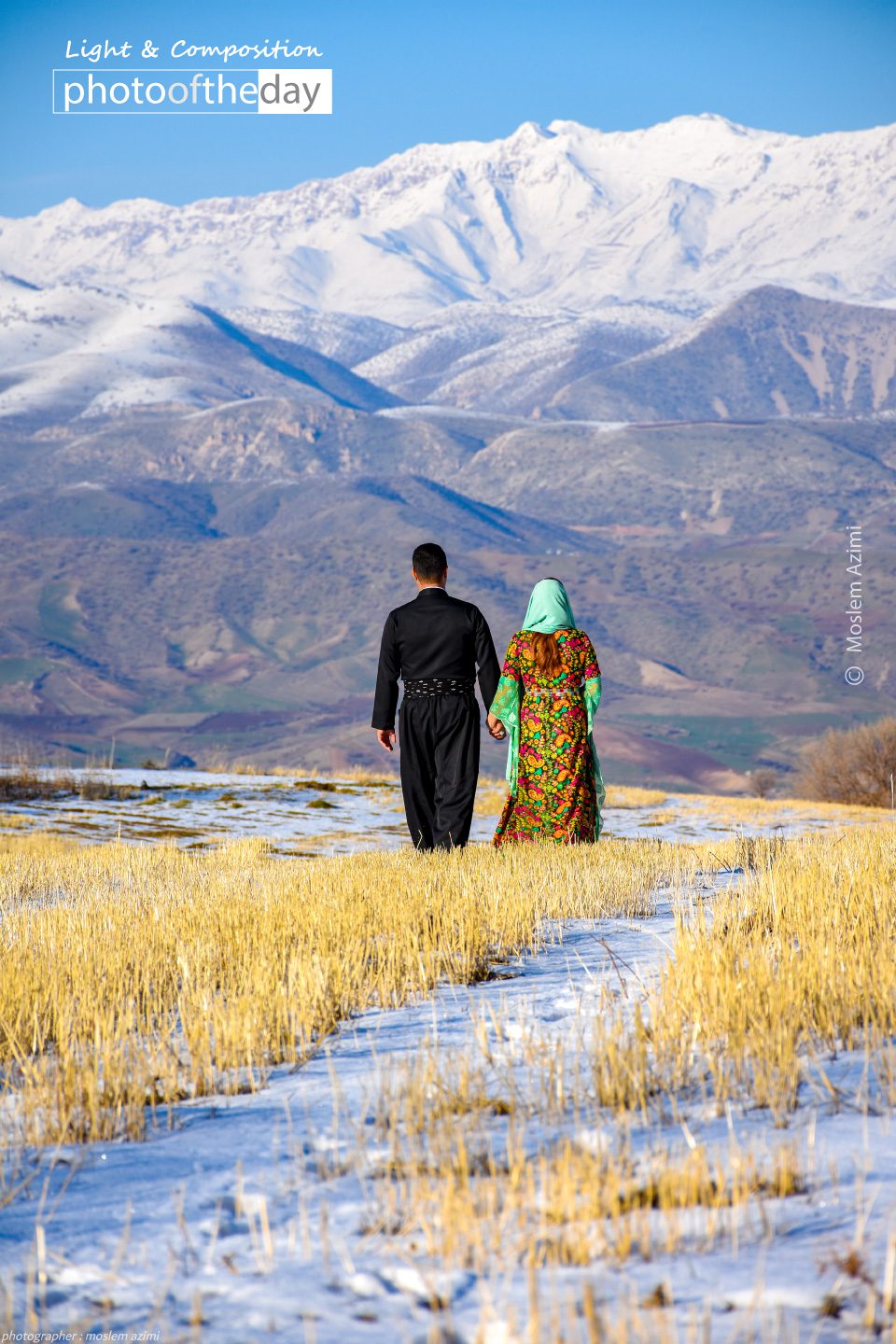 A Kurdish couple were walking in Kurdistan’s nature together, and it made a fantastic scene. The composition of snow and their colorful Kurdish clothes attracted me to get a good picture. Plants, mountains, and snow mades the opposite colors, warm and cold colors together to make a balance in this photo.