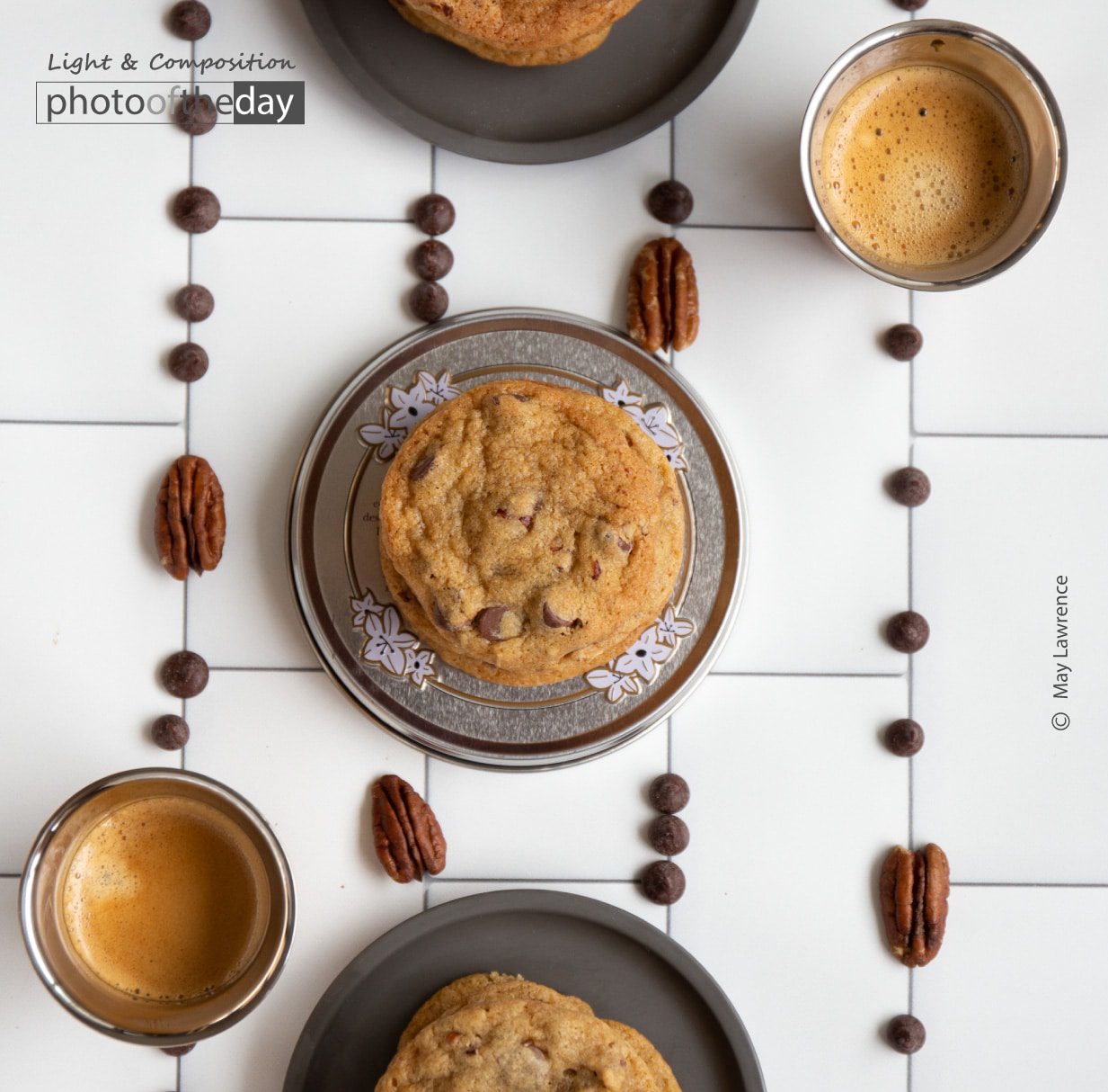 I made these chewy milk chocolate and pecan cookies to have with afternoon coffee. Typically, most photo shots of cookies have them stacked and shot on front view. I decided to try something different, especially with the new photography background of white tiles I bought. I came up with the idea of using the lines of the tiles to frame and structure my shot as a flat lay, almost using it like a grid but the grid then also becomes the background. The props consisted of coffee beans and pecans to show that it is a chocolate pecan cookie, including 2 cups of expresso as in diagonally opposite sides suggest the coffee as great accompaniments to the cookies. The shot was taken near a window using natural light in the afternoon. In the final shot, I cropped the photo to hone in on the cookie