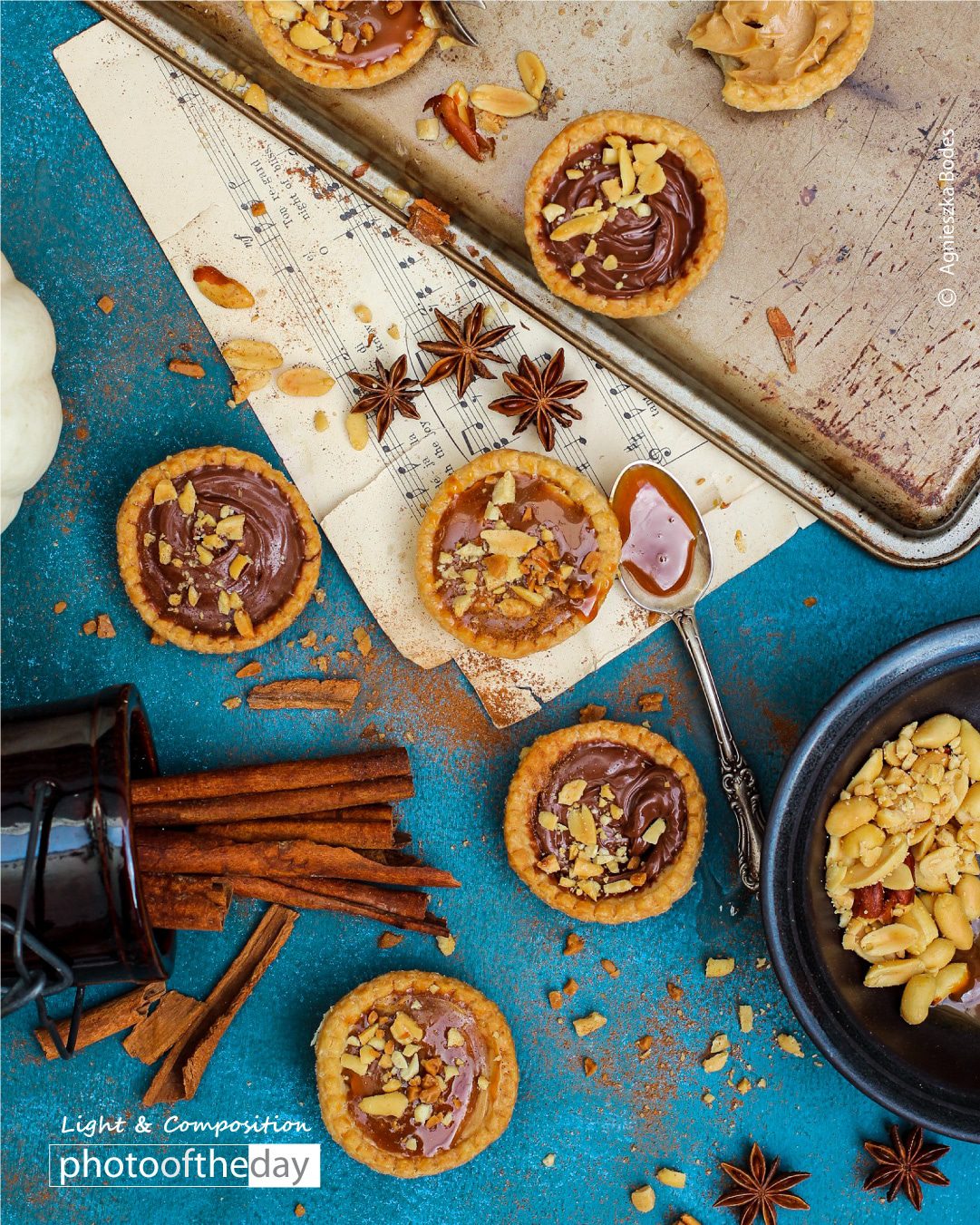 These peanut butter, chocolate and caramel tarts were too pretty not to capture. I intended to draw attention to the details and ingredients that I previously used in this recipe. I’ve decided to shoot flat-lay style in order to capture the whole scene. This photograph was taken in natural light.