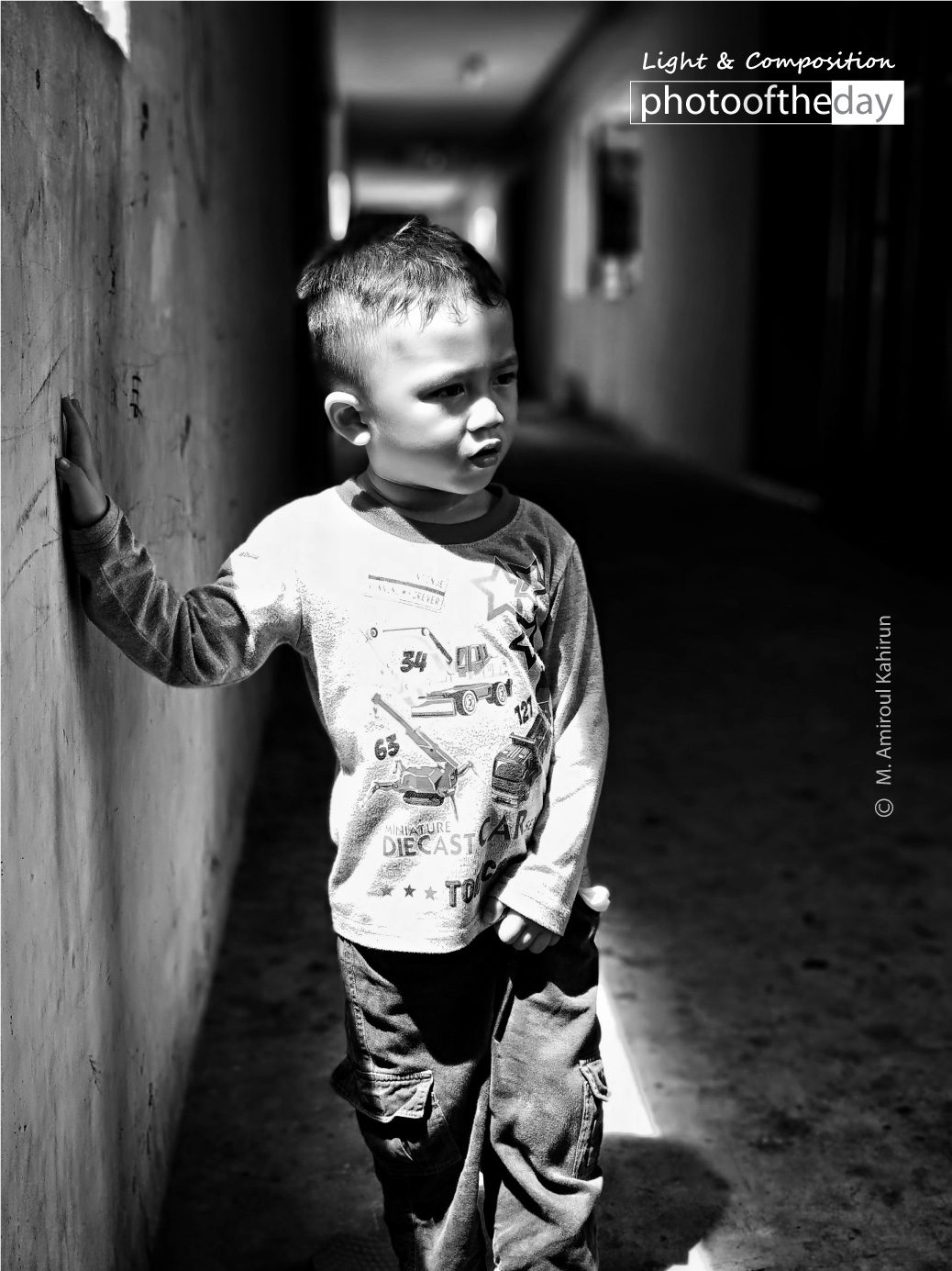 Taken in the morning, he just running back and forth, by himself along the corridor outside the house. Since I was the one who watching out at the same time, I asked him for a shot, and to look at the camera, but it just ended up with this instead.