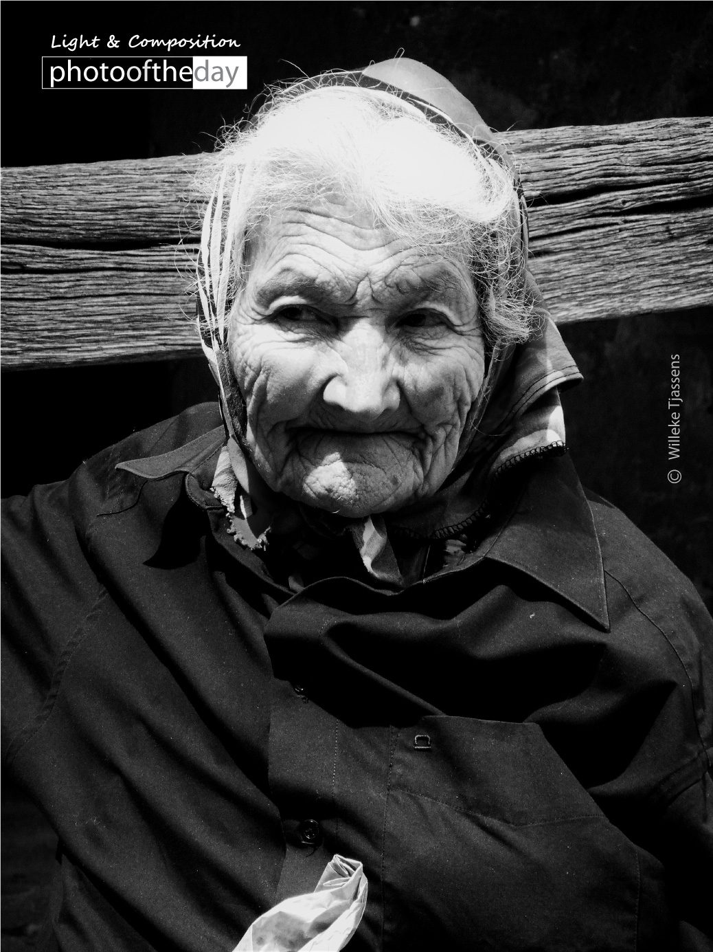 I was taken this photo in Romania. The woman was sitting outside a shop. She had a plastic bag with vegetables. She can’t speak English so I show my camera to her and ask on this way to photograph her. It was okay and the smile of her says enough.