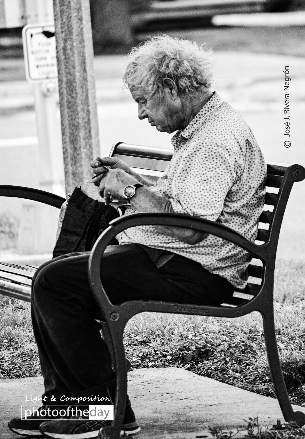 Walking through the streets of St. Pete, a small town near Tampa I saw this elderly homeless homeless sitting on a bench near the river. He was eating something from a can, couldn’t tell what it was. Well, the point is there are many old people left out, living in streets; whatever reason it is, they are living in a lonely world; one can tell by just looking at this image.