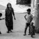 The monochromatic palette intensifies the emotional resonance, stripping away distractions to reveal the raw textures of their existence—the worn fabric, the dusty ground, the lines on the woman’s face. This choice underscores a universal narrative of care and resilience. The background, subtly blurred, hints at a bustling, perhaps challenging, environment with makeshift structures and a banner, grounding the subjects in a specific, yet relatable, context of daily life. The atmosphere is one of quiet contemplation, a moment suspended in time that speaks to enduring human bonds amidst humble surroundings.