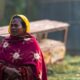 Visually, the image is a study in contrasts. The subject is adorned in a strikingly vibrant, tie-dye patterned headscarf of fuchsia and golden yellow, radiating warmth and energy. This vivid coloration stands in poignant juxtaposition with her downcast gaze and the subtle lines of concern on her face, creating powerful emotional tension. Bright, natural light illuminates her features and the rich textures of her garments, emphasizing both individuality and universal human experience.