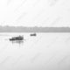 The photograph presents a study in quiet labor and the enduring relationship between humanity and the natural world. The monochrome palette emphasizes the textures of the water, the weathered wood of the boats, and the forms of the figures within, creating a timeless quality. The composition is elegantly simple, with the boats acting as focal points against the vast expanse of the water and the distant treeline. The low horizon line and the repetition of the boats create a sense of rhythm and movement, drawing the viewer’s eye across the frame. The soft, diffused light minimizes harsh shadows, lending a gentle, almost ethereal quality to the scene.