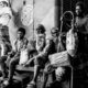 The photograph presents a poignant tableau of four young children, their forms arranged organically along a concrete path, framed by a dense, textured backdrop of foliage. Rendered in masterful black and white, the image emphasizes the intricate interplay of light and shadow, revealing the subtle textures of their simple clothing, the rough ground beneath their bare feet, and the wild growth beside them. The composition draws the viewer’s eye along the diagonal line of the path, leading to the children, whose collective gaze is directed towards an unseen point, creating a powerful sense of shared curiosity and quiet contemplation.