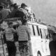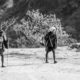 The photograph presents a stark study in contrasts, rendered in a compelling monochrome palette. Two figures, viewed from behind, traverse a sun-drenched, arid landscape. The man in the foreground carries an immense, meticulously bound load, its weight visually emphasized by the strain in his posture and the delicate support of his walking stick. His companion, though also burdened, carries a more manageable pack, yet shares a similar forward momentum. The composition is deliberately simple, focusing on the lines created by the figures’ bodies, their walking sticks, and the receding path, drawing the viewer’s eye into the depth of the scene. The textures – the rough terrain, the woven bundles, the worn fabric of their clothing – are rendered with a remarkable clarity that speaks to the enduring nature of labor and resilience.