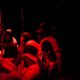 The photograph presents a striking study in silhouette and color, dominated by a monumental, grid-like structure bathed in a deep crimson glow. The composition is powerfully vertical, emphasizing the scale and imposing presence of the architecture. Figures, rendered as dark, almost abstract shapes, are scattered across the foreground, their forms dwarfed by the surrounding environment. This creates a sense of anonymity and isolation, hinting at a collective experience viewed from a distance. The limited color palette, focused on shades of red and black, amplifies the dramatic tension and evokes a feeling of both awe and unease.