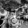 The photograph presents a study in quiet resilience, rendered in stark monochrome. A young figure, seen from the rear, walks along a weathered road, their form partially obscured by the weight of a bundle carried upon their head. The composition is deliberately asymmetrical, drawing the eye along the diagonal line of the road and the figure’s trajectory. The textures are rich – the rough surface of the road, the patterned fabric of the dress, and the coarse fur of the dog – all contributing to a sense of tangible reality. The interplay of light and shadow emphasizes the figure’s solitude, yet the presence of the dog, alert and attentive, introduces a subtle counterpoint of companionship.