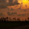 The photograph presents a striking study in contrasts, where the stark silhouettes of palm trees are dramatically set against a luminous, golden sky. The composition is elegantly simple, relying on the repetition of the trees to create a rhythmic visual flow that draws the eye towards the radiant horizon. The clouds, voluminous and textured, act as a natural frame, intensifying the warmth of the light and adding a sense of depth to the scene. The overall effect is one of quiet grandeur, a moment suspended between day and night.