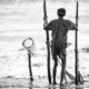 The photograph presents a compelling study in contrasts – the weathered hulls of traditional fishing boats juxtaposed against the youthful figure of a boy standing in quiet contemplation. The monochrome palette amplifies the textures of the wood, the rough fabric of clothing, and the glistening wet sand, creating a tactile experience for the viewer. The composition is masterful, utilizing leading lines formed by the boats to draw the eye towards the central figure, yet allowing the bustling activity in the background to provide a rich contextual narrative. The high-contrast lighting emphasizes the forms and creates a sense of depth, while the overall tonality evokes a feeling of both resilience and vulnerability.