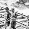 The composition is anchored by the stark, geometric weight of stacked concrete railway sleepers, which provide a brutalist contrast to the organic, gentle presence of a man crouched in quiet contemplation. His posture, hunched yet composed, suggests a moment of pause in a life defined by labor. The monochromatic palette emphasizes the interplay of textures—the rough, weathered concrete against the soft fabric of the man’s clothing and the natural scrub of the landscape. A single plastic bottle held in his hands acts as a subtle focal point, grounding the scene in the reality of the everyday.