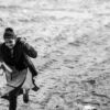 The photograph presents a study in texture and movement, rendered in stark monochrome. The composition is dominated by the expansive, fluid surface of mud, its ripples and undulations creating a dynamic, almost abstract field. A solitary figure, partially obscured, strides purposefully through this landscape, pulling a wooden frame – a tool for leveling or perhaps preparing the ground. The figure’s posture suggests both labor and a determined rhythm, a connection to the earth that is both physical and deeply ingrained.