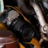 The photograph presents a still life of forgotten tools, a visual poem of obsolescence and memory. A vintage camera, encased in a worn leatherette cover, occupies the central focus, its metallic sheen catching the light amidst a collection of aged artifacts. The composition is deliberately dense, creating a sense of layered history and tactile richness. The shallow depth of field draws the eye to the camera’s lens, suggesting a lingering gaze, a past moment captured and preserved. The surrounding objects – carved figures, a decorative box bearing a national emblem – contribute to a narrative of cultural identity and the passage of time.