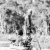 The photograph presents a study in contrasts – the raw physicality of labor against the serene backdrop of a natural waterway. The composition is dominated by the figure of a man, powerfully engaged in the act of propelling a small boat forward with a long oar. His focused expression and the tension in his arms convey a sense of determined effort, a quiet dignity in the face of demanding work. The monochrome palette amplifies the textural details – the rough weave of his clothing, the weathered surface of the boat, and the dense, reedy vegetation that frames the scene. The high contrast emphasizes the play of light and shadow, creating a dramatic effect that draws the viewer’s eye to the central figure and his immediate surroundings.