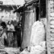 The photograph presents a compelling study in contrasts – the focused activity of children engaged in what appears to be a domestic task, juxtaposed with a direct, almost challenging gaze from the boy positioned on the right. The monochrome palette amplifies the textures of the scene: the rough-hewn wood of the table, the worn fabric of their clothing, and the varied surfaces of the plastic containers. The composition is deliberately unpolished, mirroring the raw reality of the environment, yet carefully balanced to draw the viewer’s eye through the scene. The lighting, though seemingly natural, creates a dramatic interplay of light and shadow, emphasizing the children’s faces and the objects they interact with. This is not a romanticized depiction of childhood, but a candid observation of resilience and responsibility.