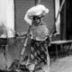 The photograph presents a striking study in contrasts, rendered in a classic monochrome palette. A man, positioned slightly off-center, stands with a quiet dignity, his hands resting on his hips, a momentary pause in his labor. The texture of his patterned shirt and the woven fabric of his headwear are rendered with remarkable detail, contrasting with the rough, organic form of the brooms he has crafted. The composition is anchored by the imposing mass of the brooms, which dominate the right side of the frame, creating a visual weight that speaks to the physicality of his work. The background, a blurred suggestion of a street scene, provides context without distracting from the central figure.