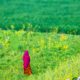 The photograph presents a vibrant tableau of rural life, dominated by an expansive field of mustard flowers in full bloom. The intense, almost overwhelming yellow creates a sea of color, punctuated by the darker greens of the foreground vegetation and the subtle forms of figures traveling through the landscape. The composition is striking in its simplicity; a horizontal division between the textured foreground and the undulating field, drawing the eye towards the small vehicle carrying passengers. The light is warm and diffused, lending a dreamlike quality to the scene, and highlighting the textures of the flowers and the clothing of the individuals. The figures, though small in scale, are the focal point, their presence suggesting a journey, a connection to the land, and the rhythms of daily life.