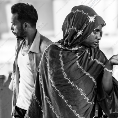 • A Woman in a Patterned Headscarf and a Man in Profile